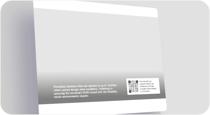 Securing a New Energy Hub in Africa West Africa Chain Stopper Operations The permanently moored floating liquefied Challenge: The project’s FLNG vessel’s Solution: Early engagement in the project’s natural gas (FLNG) storage facility in West Africa mooring devices needed to be able to operate design phase enabled Trelleborg to provide experiences similar long-period, infra-gravity in up to 10,000yr return period design wind solutions to the FLNG mooring application waves within the harbor, as act upon the LNGC conditions. This meant keeping the mooring challenges. A bespoke adjustable Chain vessels. However, being moored continually in lines in tension would require adjusting the Stopper device was developed to provide the same location, the FLNG vessel must be chain portions of the mooring lines link-by-link adjustment to chain tension by as little more durable.and then locking them in place while monitoring as 200mm using multiple jaws and a the mooring loads. This process would need to safe working load of 250T together with As a crucial element to the project’s success, be repeated as required.load monitoring. Additional features were the FLNG vessel must be moored as rigidly as developed for units specific to the project possible to enable production operations to to assist in hazardous areas operation continue. This would typically involve anchor compliance, extra dynamic adjustment chain systems – however, that does not enable range, and system redundancy. adjustment to allow for vessel sway, surge motions and tidal or loading draft changes. The FLNG vessel benefited from a reduction Scan the QR code Unplanned vessel excursions caused by in mooring line loads and vessel movement, Providing solutions that can operate in up to 10,000yr using the Marine and line breakages can cause major safety an improvement in mooring line safety return period design wind conditions, Trelleborg is Infrastructure AR App hazards for personnel and disrupt product zones, and sustainable and continuous to explore Chain Stopper transfer operations.product transfers.securing the terminal’s FLNG vessel with the flexibility in more detail. harsh environments require.