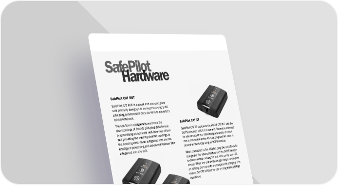 SafePilot Hardware SafePilot CAT ROT SafePilot CAT ROT is a small and compact pilot unit primarily designed to connect to a ship’s AIS pilot plug and transmit data via Wi-Fi to the pilot’s tablet/notebook. The solution is designed to overcome the SafePilot CAT XT shortcomings of the AIS pilot plug data format by generating an accurate real-time rate of turn SafePilot CAT XT combines the ROT of CAT ROT with the and providing the missing decimal readings to DGPS precision of CAT I in one unit. The unit is intended the heading data via an integrated rate sensor, for use in sets of two interchangeable units, of which intelligent processing and advanced Kalman filter one is connected to the AIS pilot plug and the other is integrated into the unit. placed on the bridge wing as DGPS receiver. When connected to the AIS pilot plug, the unit allows for charging of the internal battery and the DGPS function is disconnected, making the unit work purely as a ROT sensor. When the unit on the bridge wing is running low on battery, the two units are swapped for charging. This makes the CAT XT ideal for use on long transit pilotage operations. SafePilot CAT I SafePilot CAT I is a standalone, high-accuracy GPS receiver with the capability of GPS/GLONASS and available SBAS systems such as EGNOS, WAAS, MSAS, and GAGAN provides 1cm/sec (RMS) speed accuracy. The solution is an add-on option to CAT ROT for use in operations that demand more accurate positioning than what is provided by the ship’s own positioning through the AIS pilot plug. The use of CAT I further improves the accuracy of the speed measurements of the vessel. 15
