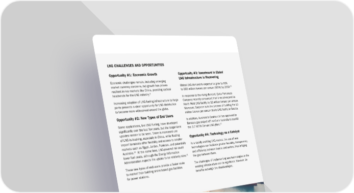 LNG CHALLENGES AND OPPORTUNITIES Opportunity #1: Economic Growth Opportunity #3: Investment in Global Economic challenges remain, including emerging LNG Infrastructure is Recovering market currency concerns, but growth has proven Global LNG demand is expected to grow by 53% resilient in key markets like China, providing cyclical 12 to 560 million tonnes per annum (MTPA) by 2030. 9 headwinds for the LNG industry. In response to the rising demand, Qatar Petroleum Increasing adoption of LNG fueling infrastructure by large Company recently announced that it would expand its ports presents a clear opportunity for LNG distribution North Field LNG facility by 32 million tonnes per annum. to become more widespread around the globe. Moreover, Gazprom is in the process of building the 13 Opportunity #2: New Types of End Users million tonnes per annum Baltic LNG facility in Russia. Some applications, like LNG fueling, have developed In addition, Australia’s Santos Ltd has approved its significantly over the last few years, but the longer-term Barossa gas project off northern Australia to backfill the 3.7 MTPA Darwin LNG plant.13 upsides remain to be seen. There is increased use of LNG in trucking, especially in China, while floating Opportunity #4: Technology as a Catalyst import terminals offer flexibility and access to smaller markets such as Egypt, Jordan, Pakistan, and potentially In a rapidly evolving LNG market, the use of new 10 Australia. At the same time, LNG-powered rail could technologies can facilitate greater flexibility, transparency, lower fuel costs, although the Energy Information and efficiency between buyers and sellers, thus bridging Administration expects the uptake to be relatively slow.11 the gap between them. These new types of end users provide a faster route The challenges of implementing new technologies in the to market than building shore-based gas facilities existing infrastructure can be significant. However, its for power stations. benefits outweigh the disadvantages.